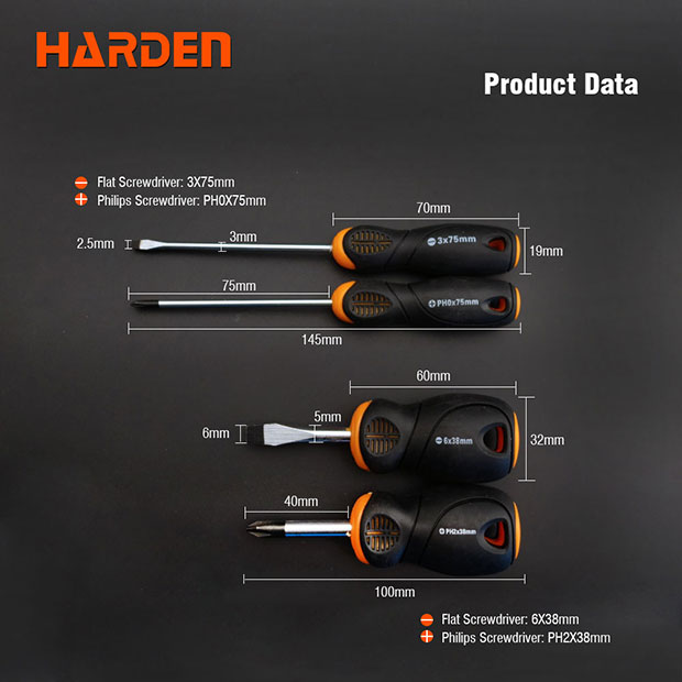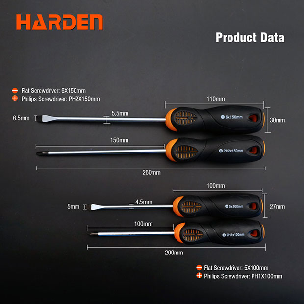 10Pcs Screwdriver Set *CRV and tempered *Comfortable TPR handle *6x38mm, 3x75mm, 5x100mm, 6x150mm *PH2x38mm, PH0x75mm, PH1x100mm, PH2x150mm *Tester 145mm *SZ Type Screwdriver